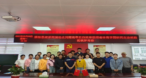 58日下午,我院在体育学院三楼会议室组织“河南青年五四奖章”获得者体育学院研究生涂采莉的筑梦青春为主题的研究生课程思政系列活动。报告会由体育学院副院长张翔主持,体育学院研究生工作秘书李金钢老师共同参与。