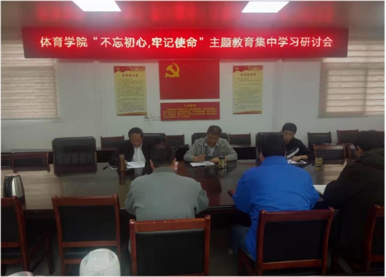 党委书记陈青首先发言,阐明了此次集中学习的目的在于总结前一段学习成果,并对理论学习结合工作实际出成效的具体情况进行交流讨论。 其次,陈书记围绕“强化学习教育”和“践行初心使命”与领导班子成员进行了交流。 他说,通过前一段的学习,深深的意识到开展“不忘初心、牢记使命”主题教育正当其时。他认为,此次主题教育是一次理论武装头脑的大阅兵,是一次刀刃向内的自我革命,是一次吹响新时代旋律的号角。通过学习,提高了自身的理论修养,强化了自身的政治素质,锤炼了自身的宗旨意识。此次主题教育,就是要围绕一个“守”字,坚守初心使命。初心本善、初心本真,唯有坚守方能行稳致远。紧盯一个“担”字,肩负时代使命。使命重在担当,奋斗铸就辉煌。聚焦一个“找”字,着力寻找差距。“刀刃向内”才能刮骨疗毒,自我革命方能涅槃重生。突出一个“抓”字,确保落实见效。千条万条,不抓落实就是白条。习近平总书记明确指出,要把学习教育、调查研究、检视问题、整改落实贯穿主题教育全过程,努力取得最好成效。总而言之,通过此次主题教育活动,要进一步增强“四个意识”、坚定“四个自信”、做到“两个维护”,以钉钉子精神狠抓工作落实,自觉同师生想在一起、干在一起,着力解决师生的操心事、烦心事,以为师生谋利、为师生尽责的实际成效践行初心使命。 最后,陈书记结合体育学院领导班子工作实际情况,谈到了近年来取得的成绩,但还存在一些问题需要立即着手去抓,去落实。