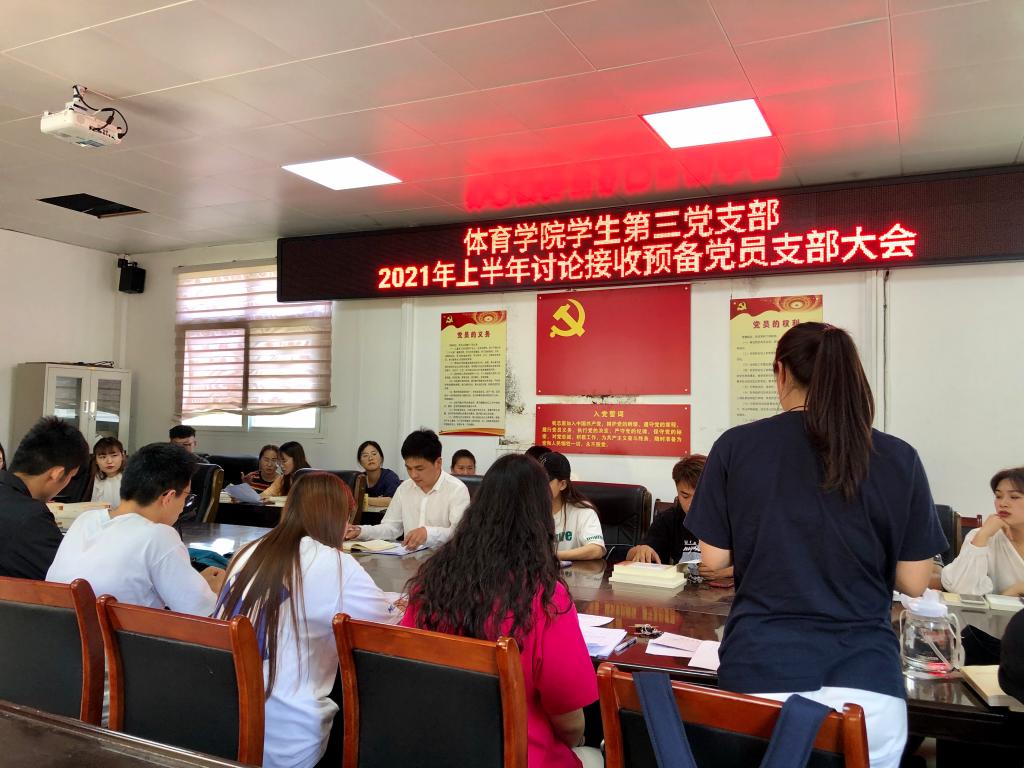 5月10日中午,体育学院学生第三党支部成员于体育楼3楼会议室召开讨论接收预备党员支部大会。会议由学生第三党支部书记程俊辉同志主持,支部全体党员以及本次发展对象参加本次会议。