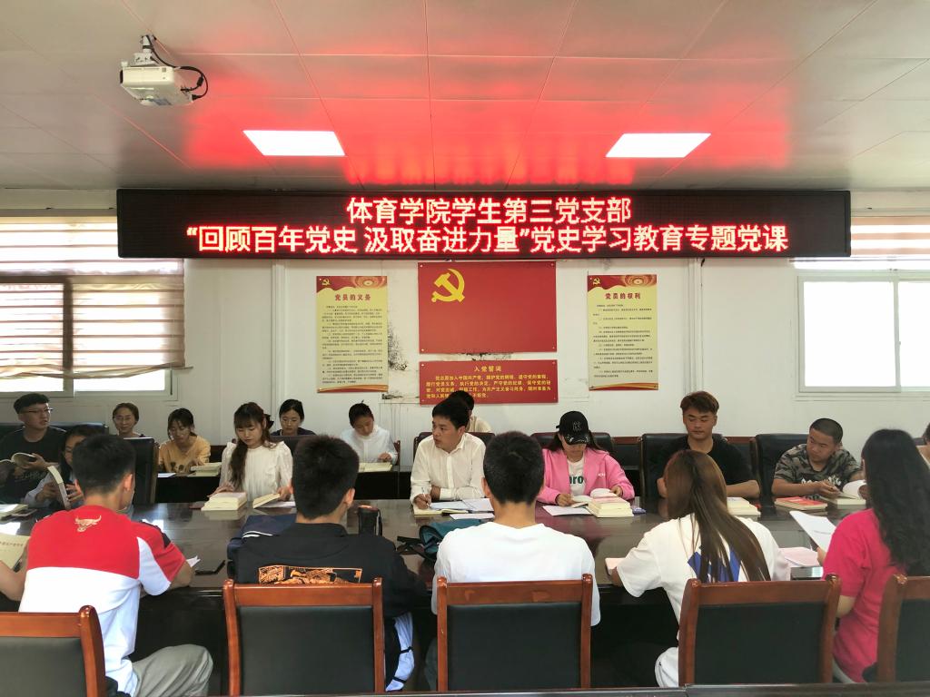 5月10日,体育学院学生第三党支部书记程俊辉为三支部成员讲“回顾百年党史 汲取奋进力量”党史学习教育专题党课,三支部全体党员参加。