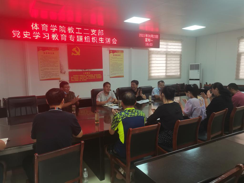8月23日下午,体育学院教工第二党支部在三楼会议室召开党史学习教育专题组织生活会,体育学院党委书记张晓峰同志及支部全体党员参加,会议由党支部书记刘波主持。
