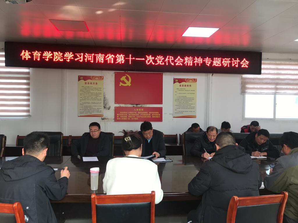 为深入贯彻落实省第十一次党代会精神, 11月16日下午,体育学院在三楼会议室召开了河南省第十一次党代会精神专题研讨会,体育学院全体教职工党员参加了此次会议,会议由体育学院党委副书记柴九昌主持。