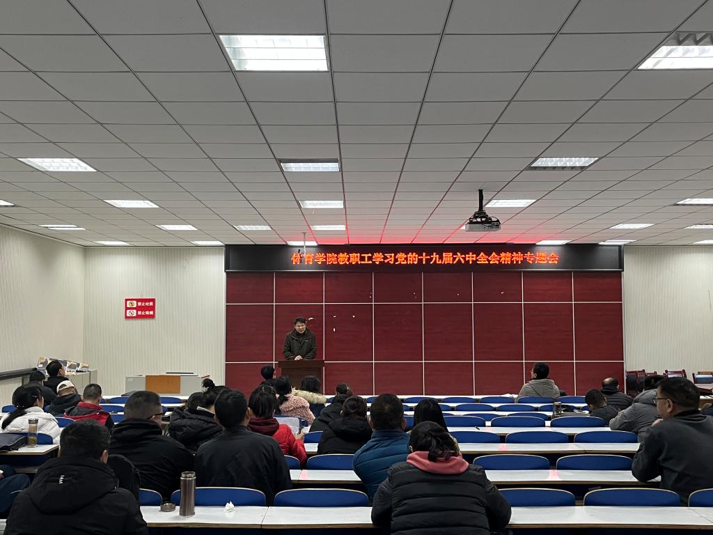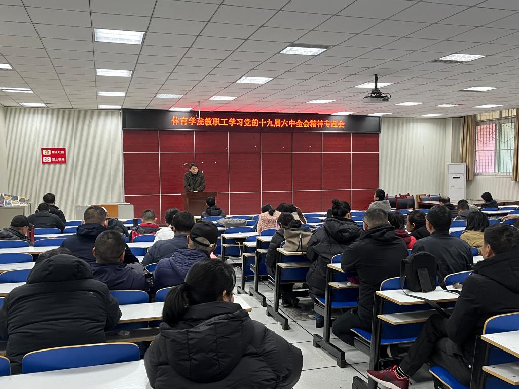 11月30日下午2:30,体育学院在体育馆多媒体教室举行集中学习党的十九届六中全会精神会议,全体教职工参加了本次会议。
