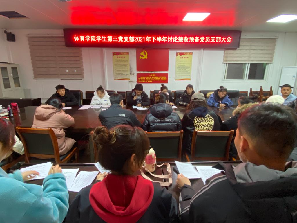 12月2日晚,体育学院学生第三党支部成员于体育楼3楼会议室召开讨论接收预备党员支部大会。会议由学生第三党支部书记程俊辉同志主持,支部全体党员以及本次发展对象参加本次会议。